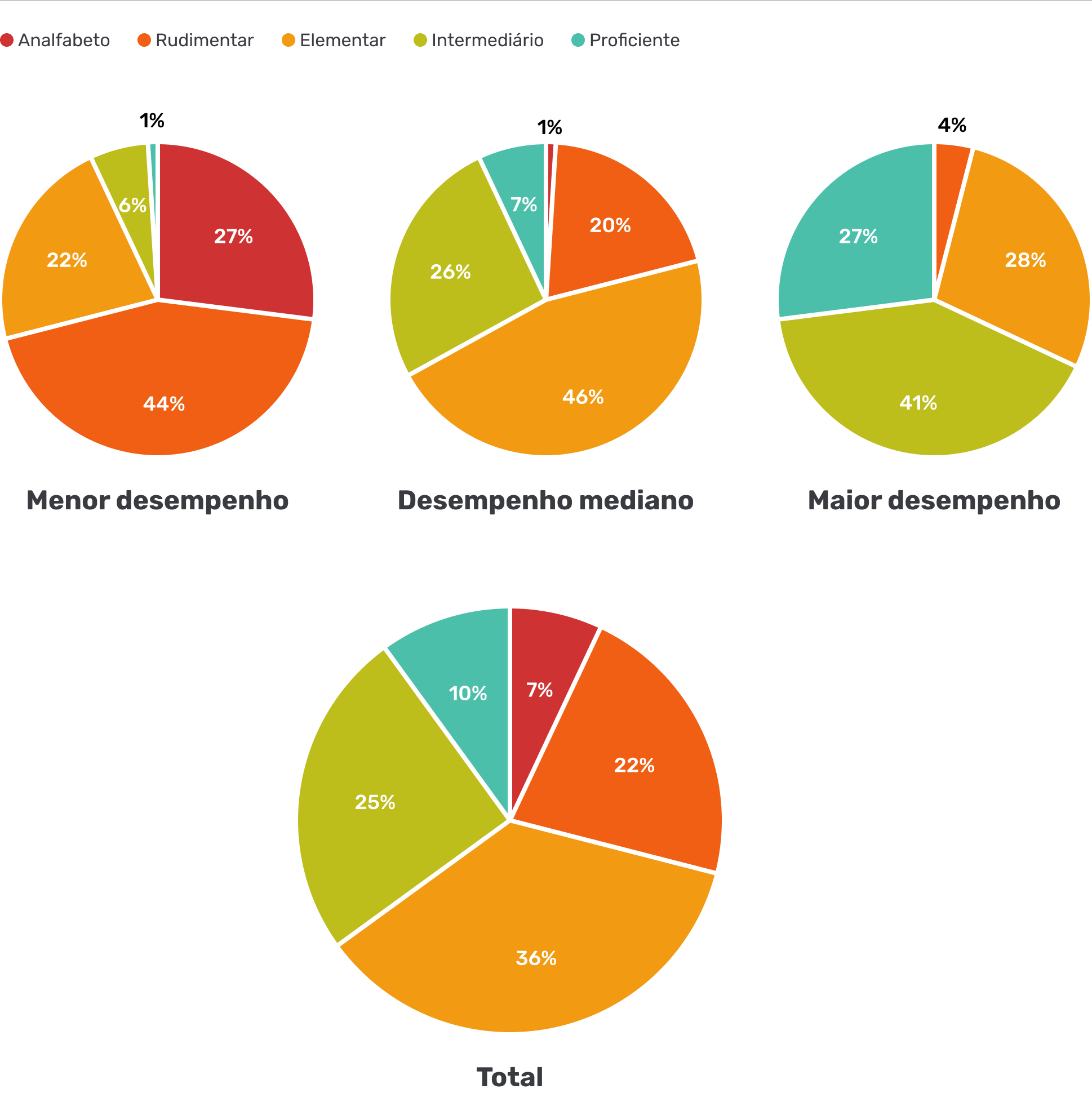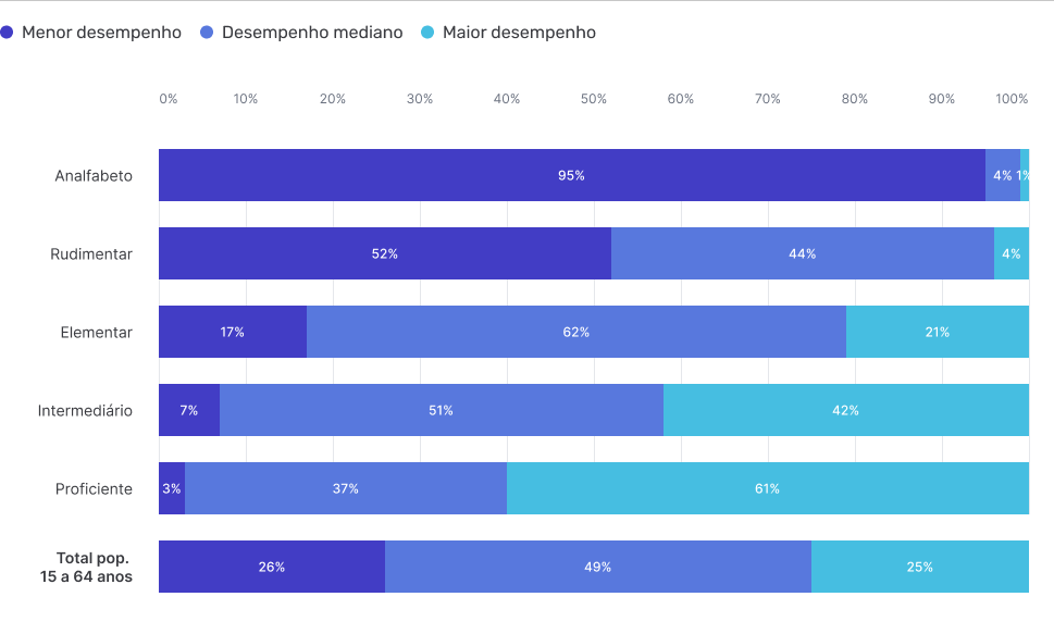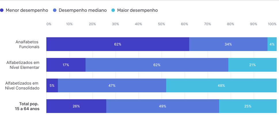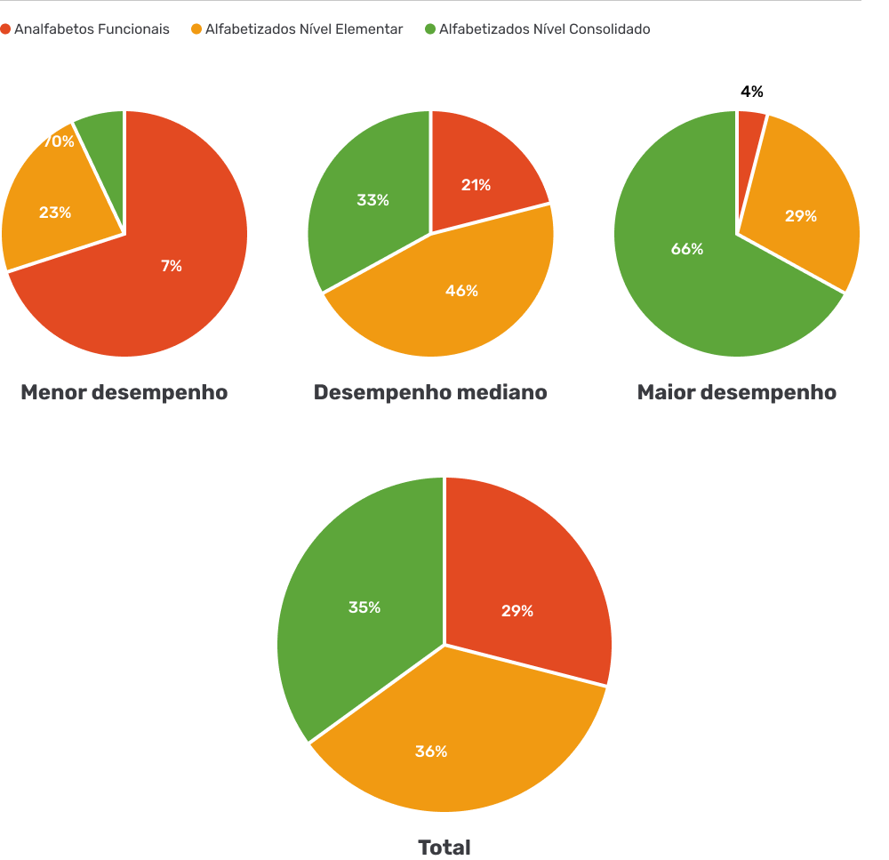 (analfabetos funcionais = nível analfabeto + nível rudimentar // nível consolidado = nível Intermediário + nível Proficiente)