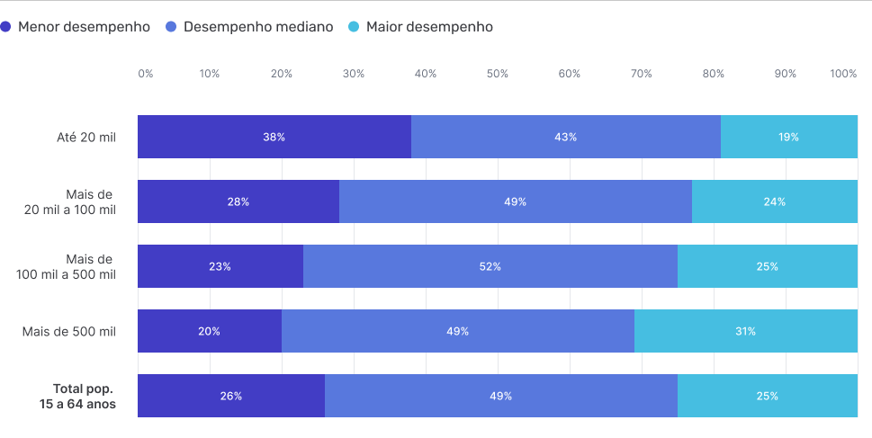 Indivíduos com Maior desempenho, Desempenho mediano e Menor desempenho no teste digital por Tamanho do município (em milhares de habitantes)